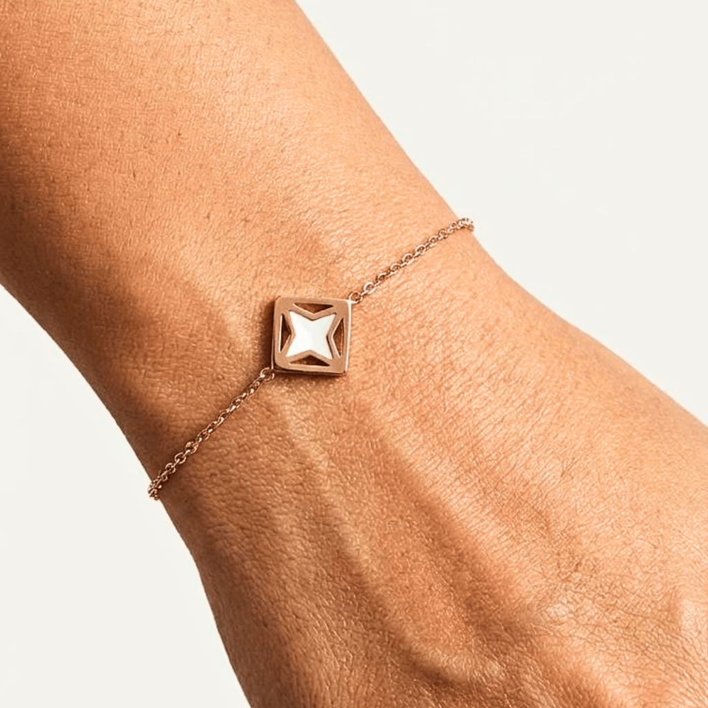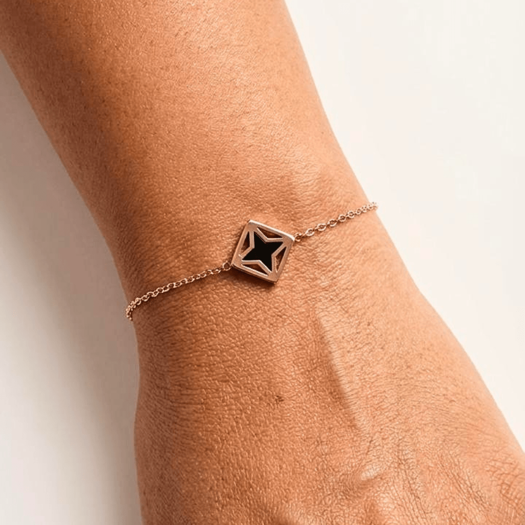 Add a touch of elegance to your jewelry collection with this dainty rose gold bracelet featuring a diamond-shaped dual-side charm. Designed for versatility and modern style, the charm is reversible. Showcasing a sleek black side and a classic white side, so you can switch your look effortlessly.