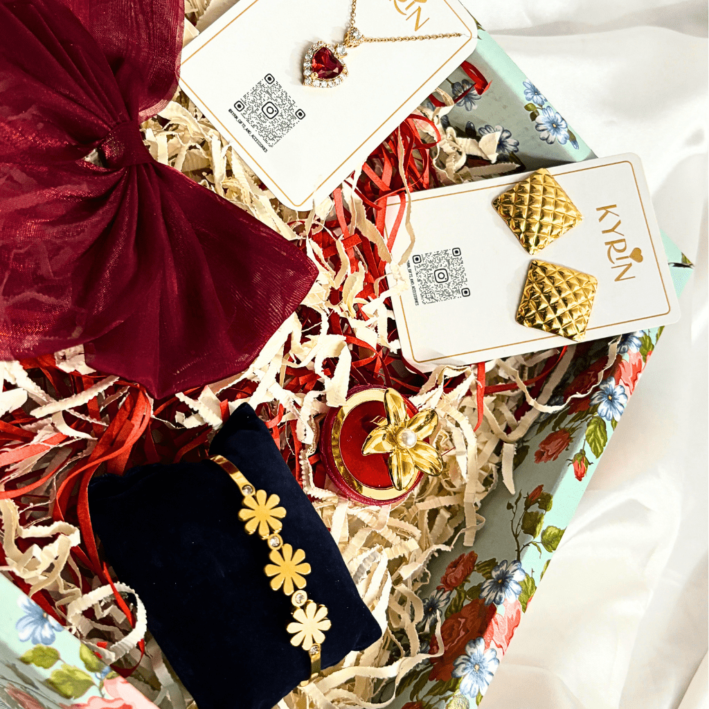 Make gifting extra special with the Kyrin Premium Gift Hamper, a beautifully curated collection of stylish hair accessories and anti-tarnish jewellery—perfect for birthdays, celebrations, or thoughtful surprises.