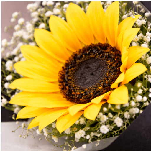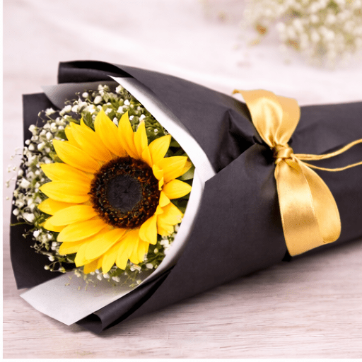 This elegant single sunflower handmade bouquet is crafted with a lifelike artificial sunflower and stylish black wrapping for a modern gifting look. The golden ribbon and handmade with love tag add a special handcrafted touch. A lasting flower gift that stays beautiful forever.