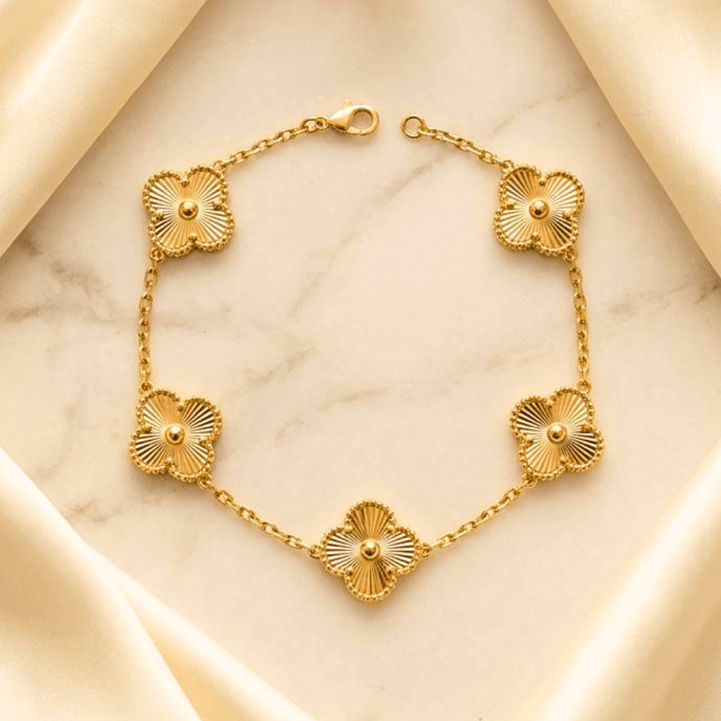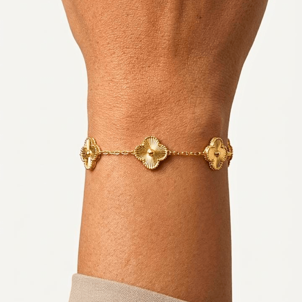 Add a touch of timeless elegance to your jewelry collection with this premium 18K gold plated clover charm bracelet. Designed with a delicate and minimal aesthetic, the iconic clover motif symbolizes luck, love, and positivity making it both stylish and meaningful.